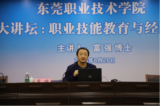 6月26日上午,我校举办“职业技能教育与经济转型的契合”专题讲座,讲座由新加坡学者富强博士主讲,学校二级学院负责人、骨干教师约120余人参加了此次讲座。讲座由校党委委员、教务处处长王志明主持。