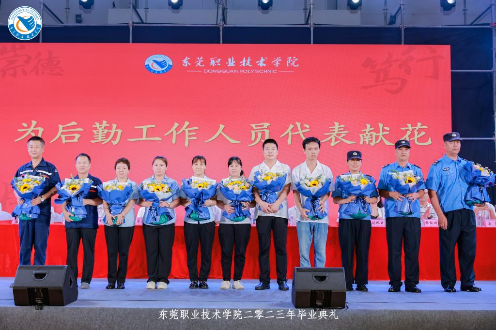 毕业典礼在庄严的国歌声中拉开了序幕。经济与管理学院许绮雯代表毕业生发言,她向母校和所有老师的辛勤培育表达了深深的感谢,表示会以努力和汗水,谱写人生新篇章,以实际行动展现作为东职人的风采。随后,毕业生代表为辛勤耕耘的优秀教师代表和默默付出的后勤工作人员献花,感谢他们的谆谆教导和辛勤付出。