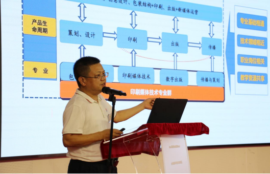 数字媒体学院李小东院长做了“印刷媒体技术专业群建设与思考”报告,他认为,专业群建设发展必须加强校企合作,产教深度融合,人才共育。