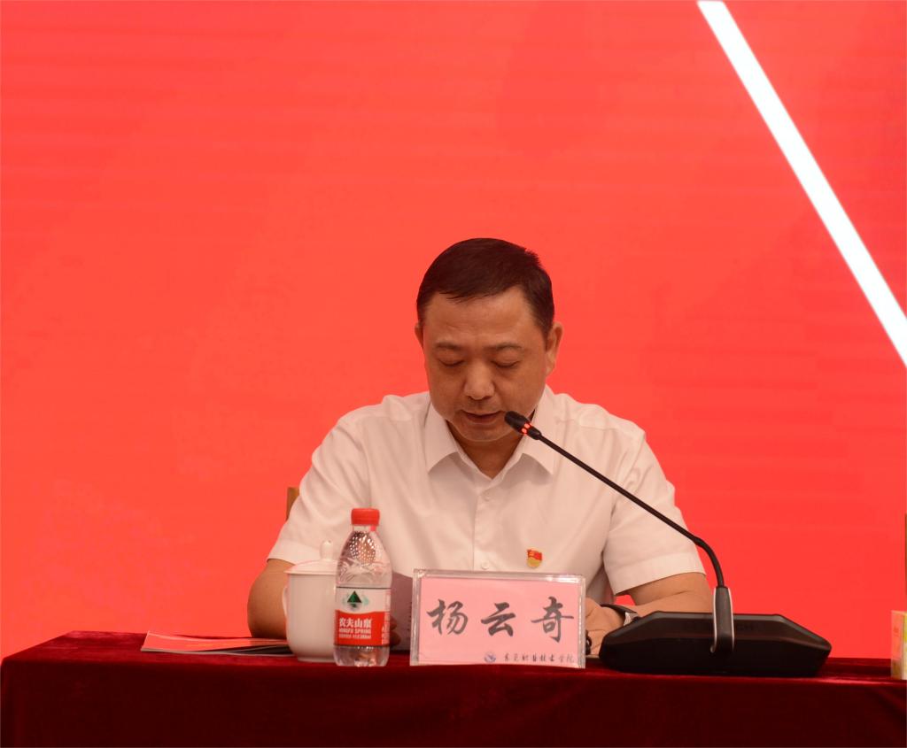 校党委副书记、校长贺定修在大会上做报告。他表示,今年是全面贯彻落实党的二十大精神的开局之年,也是学校冲刺第一轮“双高”验收向高质量发展迈进的关键之年,上半年,学校坚持以习近平新时代中国特色社会主义思想为指导,深入学习贯彻党的二十大精神,聚焦高质量发展和安全稳定两个主题,深入实施“八大行动”,全力推动以“双高”建设为牵引的提质、扩容、升级、赋能,学校各项工作取得新进步。一是举旗铸魂有凝聚力。思想政治工作深入推进,基层党组织建设再上台阶,共青团工作成效明显,党风廉政建设不断加强。二是任务攻坚有战斗力。“双高”建设成效明显,省级高水平专业群建设加快推进,办学条件全部达标。三是人才培养有竞争力。教育教学改革不断深化,师资队伍建设逐步加强,学生技能比赛再创佳绩。四是赋能发展有影响力。科研服务、继续教育、结对帮扶、对外交流等方面都有新突破,更好的服务经济社会高质量发展。五是服务师生有保障力。校院联动的学生工作扎实开展,以人为本的民生实事持续推进,体现特色的校园文化繁荣发展,良法善治的校园环境有力打造。