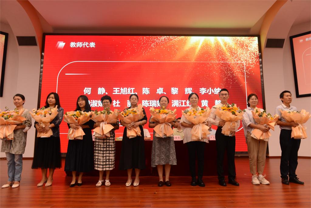 大会在庄严的国歌声中正式开始。机关党总支专职副书记易雅琴带领全体教职员工向国旗宣誓,勉励全体教职工要不忘教育初心,牢记育人使命,立誓奉献教育事业。学生代表为辛勤耕耘在一线的优秀教职工代表献上鲜花,感谢他们的默默付出与坚守,向无私敬业的他们致敬。