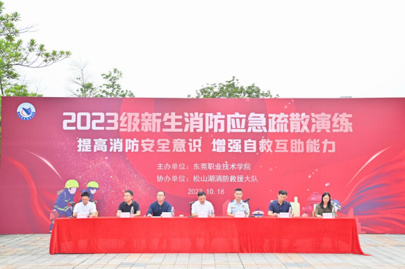 10月18日下午,我校联合松山湖消防救援大队在学校教学楼举行了2023级新生消防灭火疏散演练活动。学校党委委员、副校长杨云奇、松山湖消防救援大队中队长杨锦标出席了活动,各相关业务部门领导、各二级学院副书记、校卫队、2023级新生共3000多人参加,演练活动由保卫处处长刘高明主持。