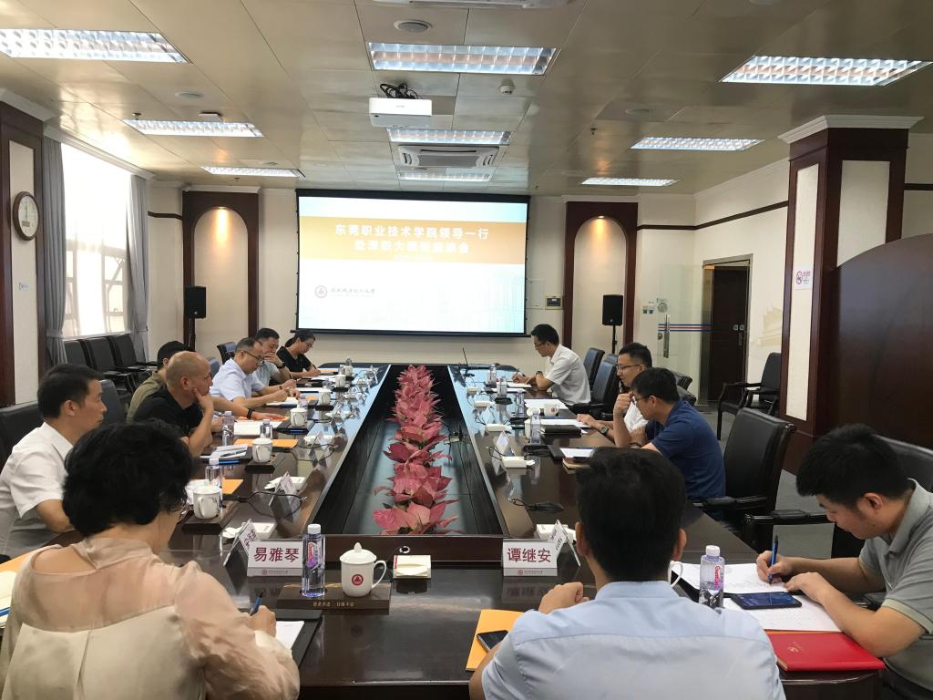 深圳职业技术大学党委副书记、校长许建领表示,希望两家院校携手,共同为深莞地区做好职业技术人才的培养。我校党委副书记、校长贺定修对深圳职业技术大学此次接待表示感谢,希望能学习兄弟院校的先进理念和宝贵经验,将调研成果转化为推动学校高质量发展的有效举措。