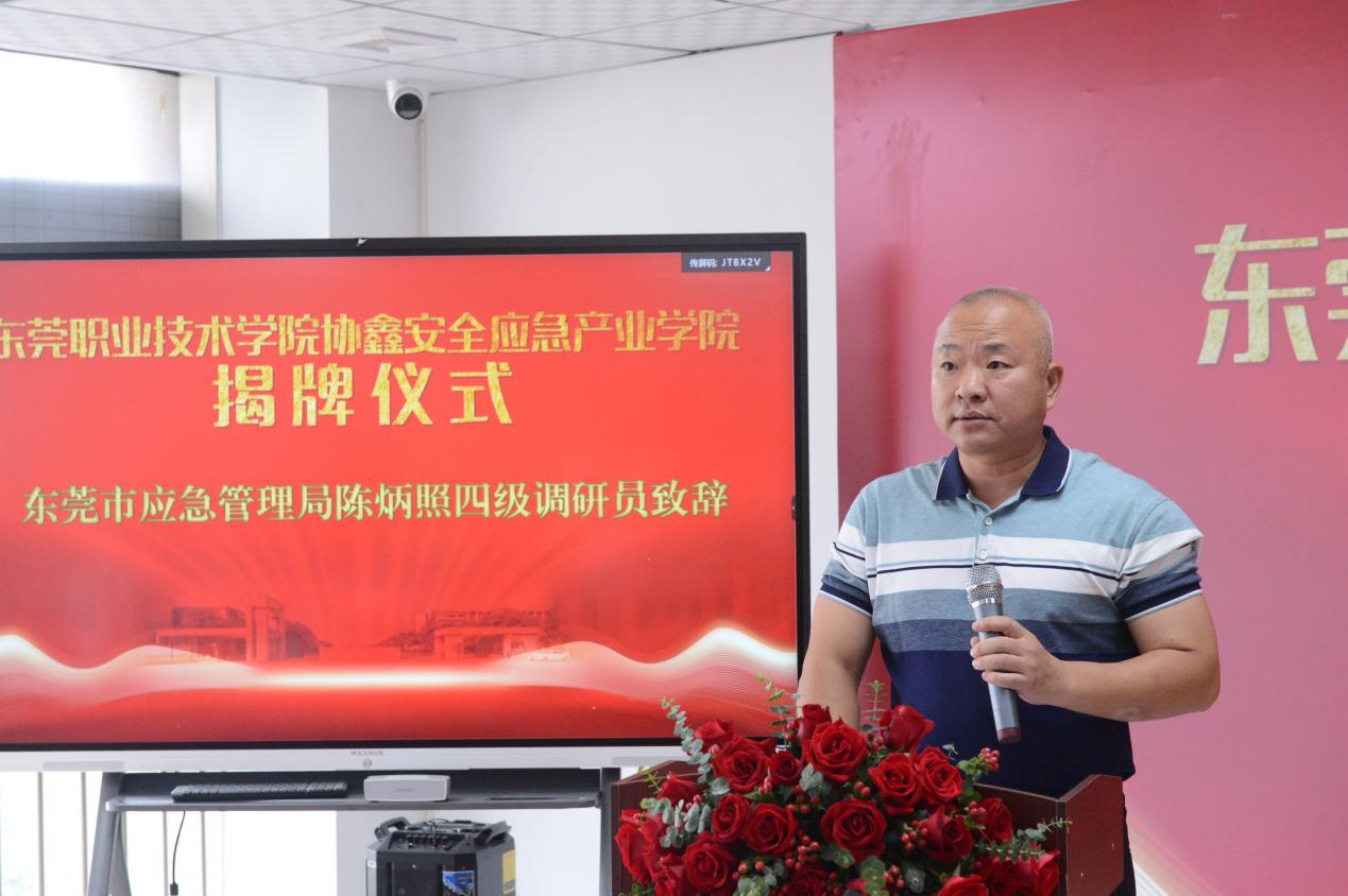 应急管理局四级调研员陈炳照代表东莞市应急管理局对学院的成立表示衷心的祝贺,他表示,在未来学院的发展过程中,东莞市应急管理局将在应急科技、应急技术、应急装备、应急机制等各方面对学院应急人才培训提供最大的便利条件,同时在政策方面给予更多的支持和鼓励,不断地推动学院源源不断向社会输送高质量、高素质的应急专业人才。