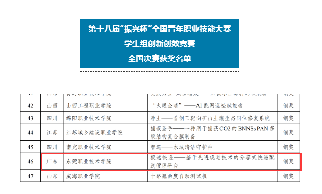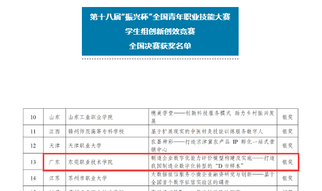 近日,由共青团中央、人力资源社会保障部主办的第十八届“振兴杯”全国青年职业技能大赛学生组全国决赛在郑州举行。本届大赛以“踔厉奋发启新程 挺膺担当建新功”为主题,我校共有两个项目入围学生组创新创效竞赛全国决赛,最终由蒋键等老师指导的项目《制造企业数字化能力评价模型构建及实施——打造我国制造业数字化转型的“D市样本”》获“高职组管理创新类”银奖,由骆剑锋等老师指导的项目《极速快递——基于先进规划技术的分享式快递配送管理平台》获“高职组技术革新类”铜奖。此外,由赵佳等老师指导的项目《非遗传承,数智助创》获“高职组创意设计类”优胜奖。
