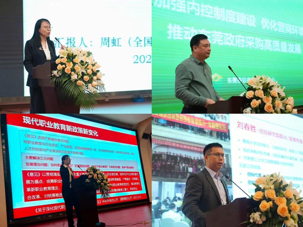 共同体启动仪式结束后,大会举办了政府采购行业产教融合共同体论坛,我校产教融合办公室主任何风梅教授、东莞市公共资源交易中心郑宽余副主任、政府采购研究院有限公司刘春胜总监、经济与管理学院院长周虹教授分别就《行业产教融合共同体形成逻辑及建设路径》、《优化政府采购营商环境推动东莞政府采购高质量发展》、《从政府采购发展趋势看行业人才培养路径》、《职业教育高质量发展与双高专业群建设》等内容进行了交流分享。
