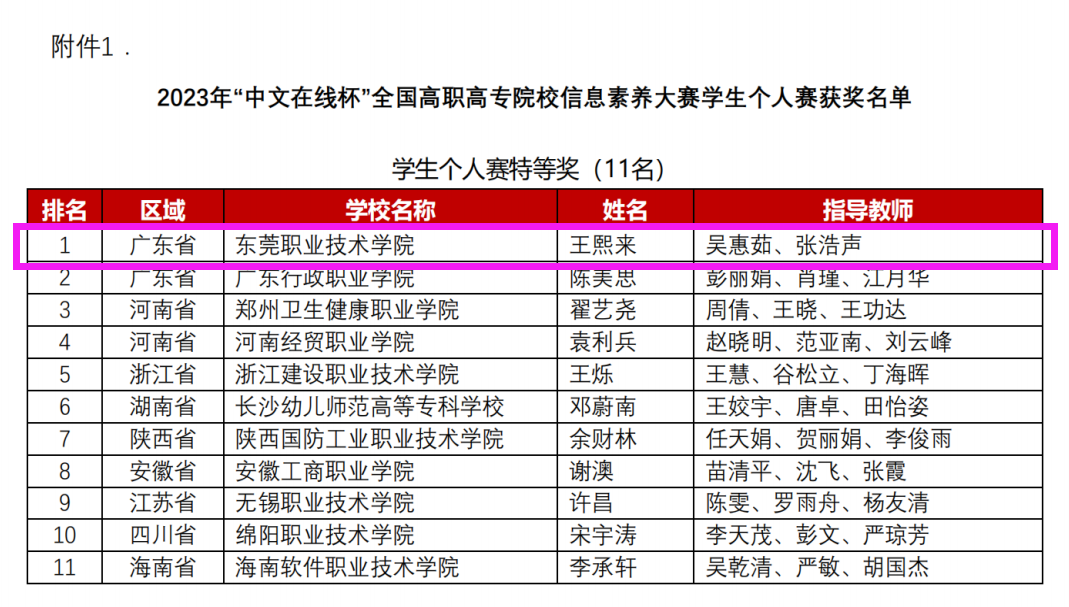 近日,2023年第五届全国高职高专院校信息素养大赛决赛圆满落幕并公布了获奖名单,由我校图书馆吴惠茹、张浩声老师指导的商贸学院2022级王熙来同学以总分全国第一名的成绩荣获学生个人赛全国特等奖,电子信息学院2021级叶祉良同学荣获全国二等奖。同时,吴惠茹、张浩声老师荣获优秀指导教师奖,吴惠茹老师荣获先进工作者奖,我校荣获最佳组织奖。取得了该赛事举办以来学生个人赛广东省的最好成绩,获奖等次和数量在全国高职院校名列第一。
