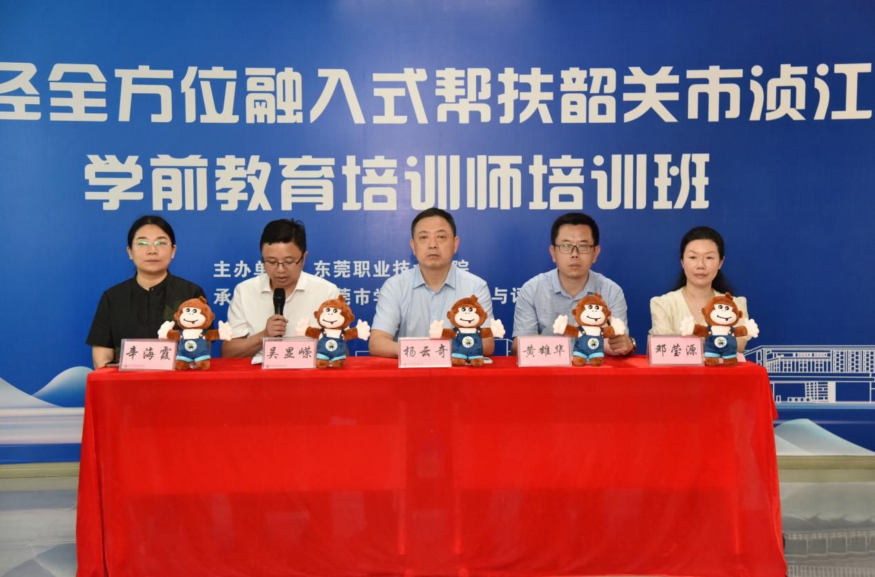 为落实广东省全口径全方位融入式帮扶粤东粤西粤北地区基础教育高质量发展实施办法要求,帮助韶关市浈江区学前教育实现由“输血”到“造血”的转变,我校于7月7日至7月11日举办对口帮扶韶关市浈江区“学前教育培训师培训班”。7月8日下午,开班仪式在我校人文艺术大楼909培训室举行。我校党委委员、副校长杨云奇,学校党委组织部部长、人事处处长吴显嵘,韶关市浈江区教育局党组成员、浈江区教师发展中心主任黄雄华,副主任邓莹源以及我校教师代表、东莞市学前教育研训与评估中心理事代表和培训班全体学员参加了开班仪式。