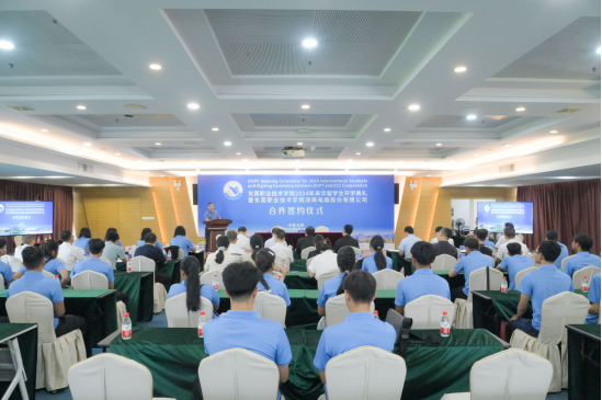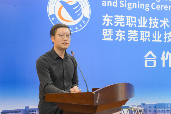 深南电路股份有限公司人力资源部总监方耿森代表企业发言。他介绍了企业的发展历程以及海外业务的拓展情况。他指出,深南电路作为印制电路板行业的龙头企业,勇于担当引领行业健康发展的历史使命。本次签约仪式的成功举办,是双方共同努力的结果,契合企业和学校合作发展的共同需求,具有里程碑式意义,希望双方发挥优势,为服务企业“走出去”培养更多国际化技术技能人才。