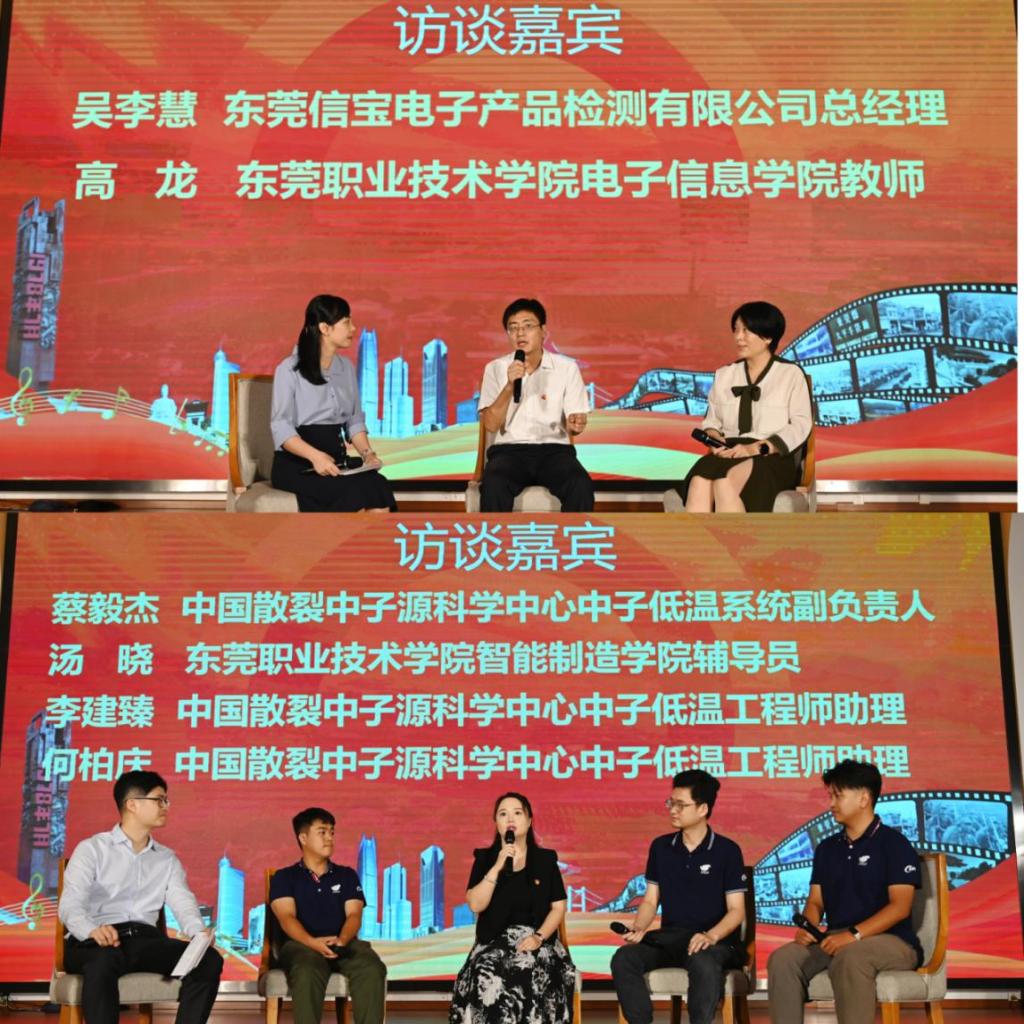在访谈环节中,企业代表东莞信宝电子产品检测有限公司总经理吴李慧与我校教师代表电子信息学院高龙老师分别分享如何在校企合作工作中让学校培养出企业需要的人才。在中国散裂中子源科学中心工作的两位2022届毕业生,分别分享了他们如何将自己所学所知应用到实践工作中,并通过自己的不断探索学习,把工作做到精益求精。参与访谈的中国散裂中子源科学中心低温系统副负责人蔡毅杰老师和我校智能制造学院辅导员汤晓老师也对两位毕业生同学给予了高度评价。