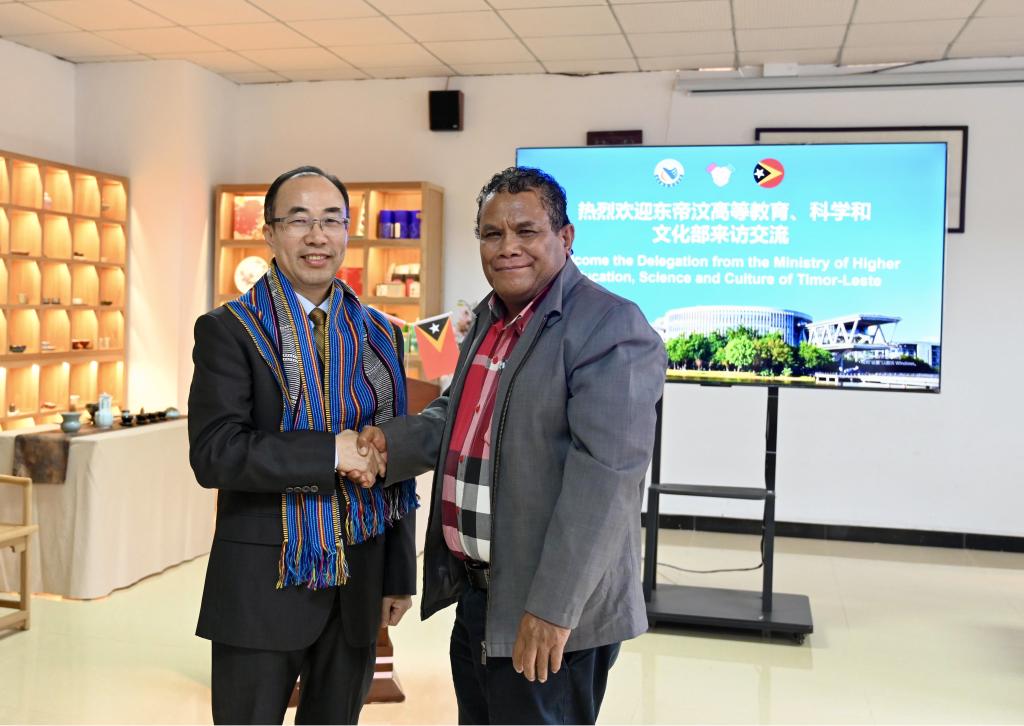 贺定修校长对东帝汶教科文团组、马来西亚国际文化交流中心的来访表示热烈欢迎,并简要介绍了学校的发展概况和特色优势。他指出,学校欢迎东帝汶社会各界来华学习交流,学校将积极创造机会,为推进两国在留学生教育、职业培训和人文交流等方面务实合作做出更大贡献。