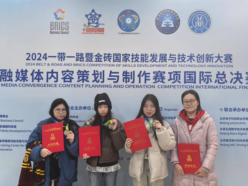 12月20日,2024“一带一路”暨金砖国家技能发展与技术创新大赛之第二届融媒体内容策划与制作国际总决赛在北京电子科技职业学院举行。数字媒体学院数字出版专业朱晓希、潘晓蓝、蓝可馨三位同学凭借出色的团队协作和专业技能,在总决赛中荣获全国二等奖。李大红、陆晓红老师荣获大赛“优秀指导教师”荣誉称号,我校获优秀组织奖。