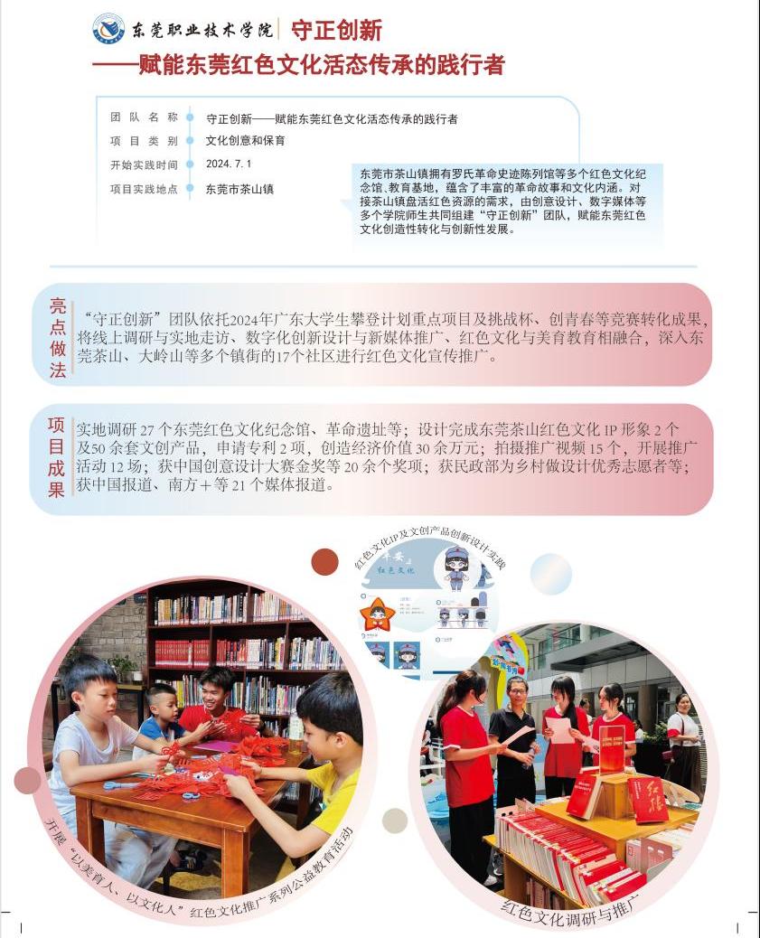 2024年,校团委围绕广东青年大学生“百千万工程”突击队行动,组建86支立项团队,拓展14个领域,覆盖4省9市13区县35镇,引导广大青年学子赴县镇村一线开展实践。创意设计学院“守正创新——赋能东莞红色文化活态传承的践行者”项目依托2024年广东大学生“攀登计划”重点项目、“挑战杯”等竞赛转化成果,将线上调研与实地走访、数字化创新设计与新媒体推广、红色文化与美育教育相融合,深入东莞市茶山镇、大岭山镇等多地的17个社区进行红色文化宣传推广。设计完成东莞茶山红色文化IP形象2个、文创产品50余套,申请专利2项,拍摄推广视频15个,开展推广活动12场,创造经济价值30余万元,获南方+等21家媒体报道。