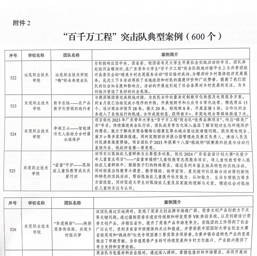 会上,团省委公布了2024年广东青年大学生“百千万工程”突击队行动100个优秀品牌项目和600个典型案例。我校创意设计学院“守正创新——赋能东莞红色文化活态传承的践行者”入选“优秀品牌项目”;商贸学院“数字农链——农产品数字化营销的践行者”、智能制造学院“净湖卫士——智能清污无人船助力古村落水域保护”、体育学院“‘益童’守护——孤独症儿童性教育成长关爱行动”、人工智能学院“‘非遗焕新’——焕新莞香传承路,共筑乡村振兴梦”4个项目获评“典型案例”。