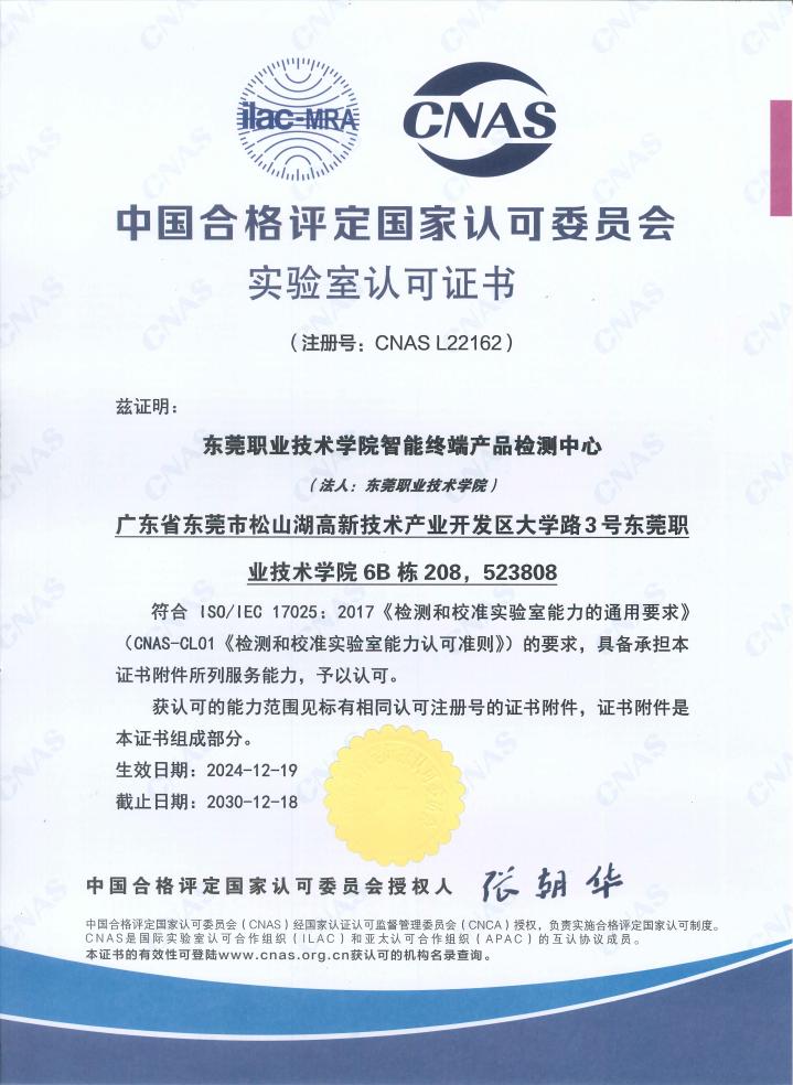获得CNAS认可资质,标志着我校智能终端产品检测中心具备了国家认可的为企业提供智能终端产品检测认证服务的能力,这将进一步吸引更多优质企业深度参与协同育人,共同开展技术研发与项目合作,提升学校社会影响力和产业服务能力,并为东莞及周边智能移动终端产业输送更多高素质技术技能人才。