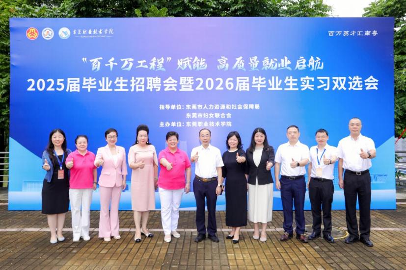 为贯彻落实“百日冲刺”行动方案,进一步推进2025届毕业生就业工作,同时引导2026届毕业生提前安排实习计划,6月26日上午,我校举办2025届毕业生招聘会暨2026届毕业生实习双选会。我校党委副书记、校长贺定修,党委委员、副校长杨云奇,东莞市人力资源和社会保障局党组成员、副局长汤丽华,东莞市妇联党组成员、副主席张琦等领导到现场指导工作。