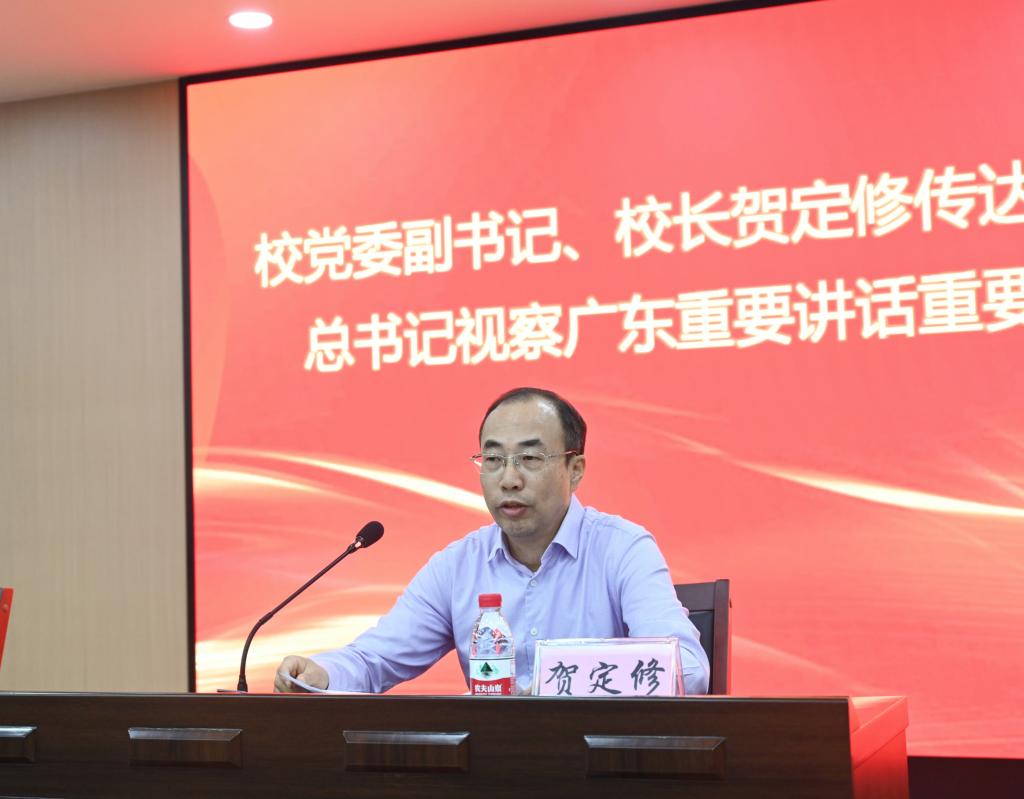 会上,党委副书记、校长贺定修传达学习习近平总书记视察广东重要讲话重要指示精神。马克思主义学院党总支书记石文斌、教育与体育学院党组织负责人杨乃彤以及通识学院党组织负责人陈柏林结合自身工作依次作交流发言。