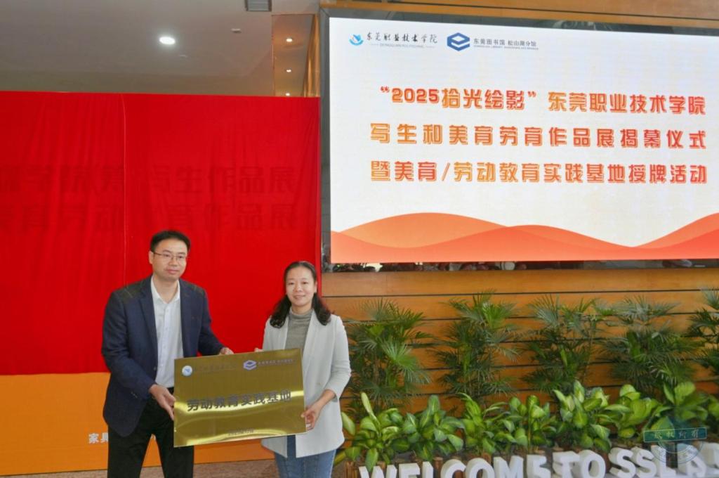 致辞结束后,我校创意设计与传媒学院(筹)党组织负责人车美娟、通识学院(筹)行政负责人肖庆丰代表学校分别参与了“美育实践基地”与“劳动教育实践基地”授牌仪式。此次实践基地的正式挂牌,标志着我校与松山湖图书馆的合作迈入新阶段。