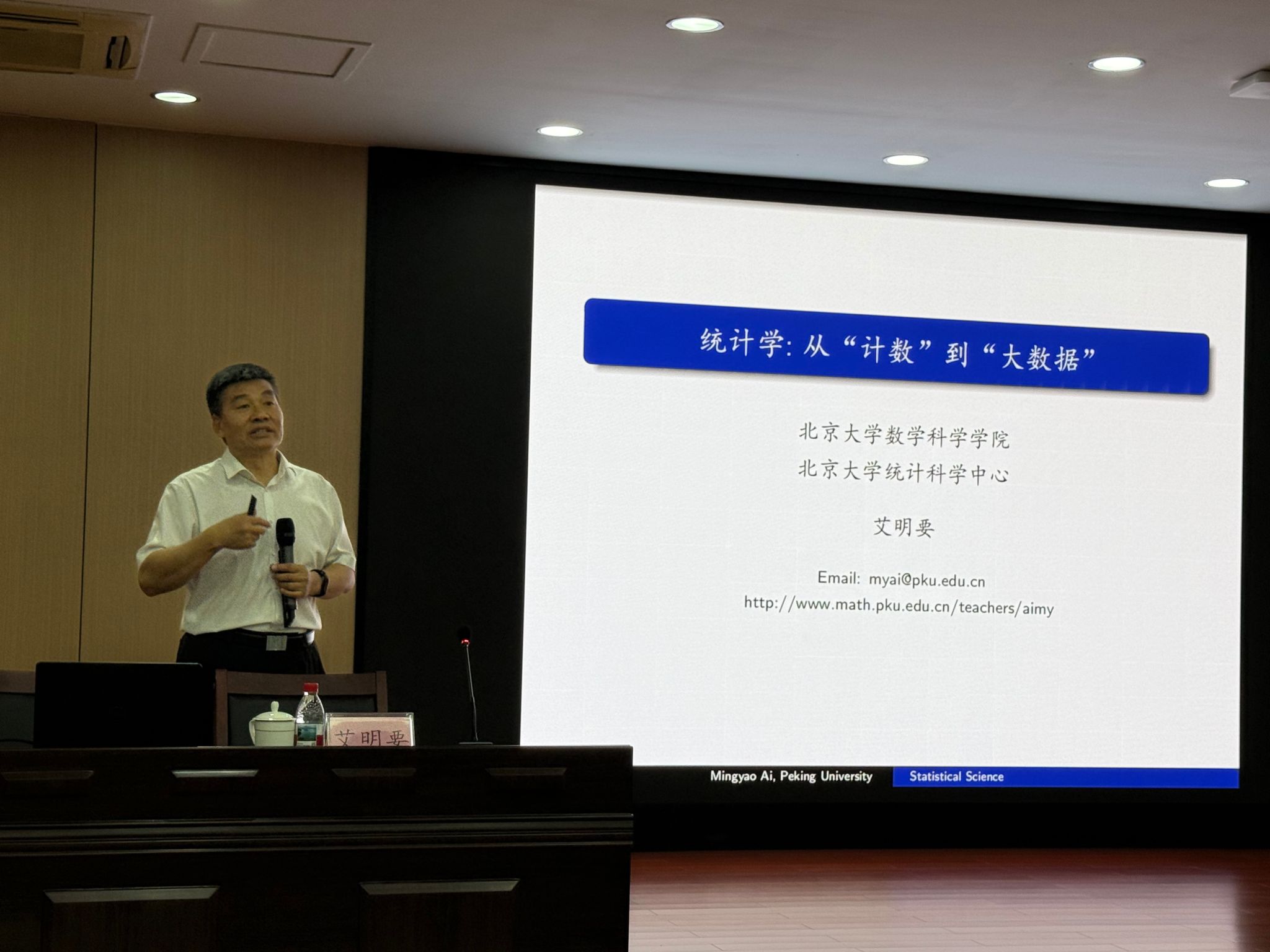 12月22日下午,北京大学二级教授、著名统计学家艾明要教授应邀来校,作题为“统计学:从‘计数’到‘大数据’技术应用”的专题学术报告。校党委副书记、校长贺定修出席报告会,报告会由科研处处长陈俞强主持。我校人工智能学院、商学院(筹)、通识学院(筹)相关专业200余名师生代表到场聆听。