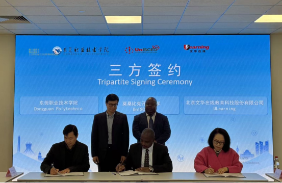 1月23日上午,东莞职业技术学院、莫桑比克开放大学(UnISCED)与北京文华在线教育科技股份有限公司在横琴“中国-葡语(西语)国家经济贸易服务中心”签署合作协议,并举行远程教育基地揭牌仪式。