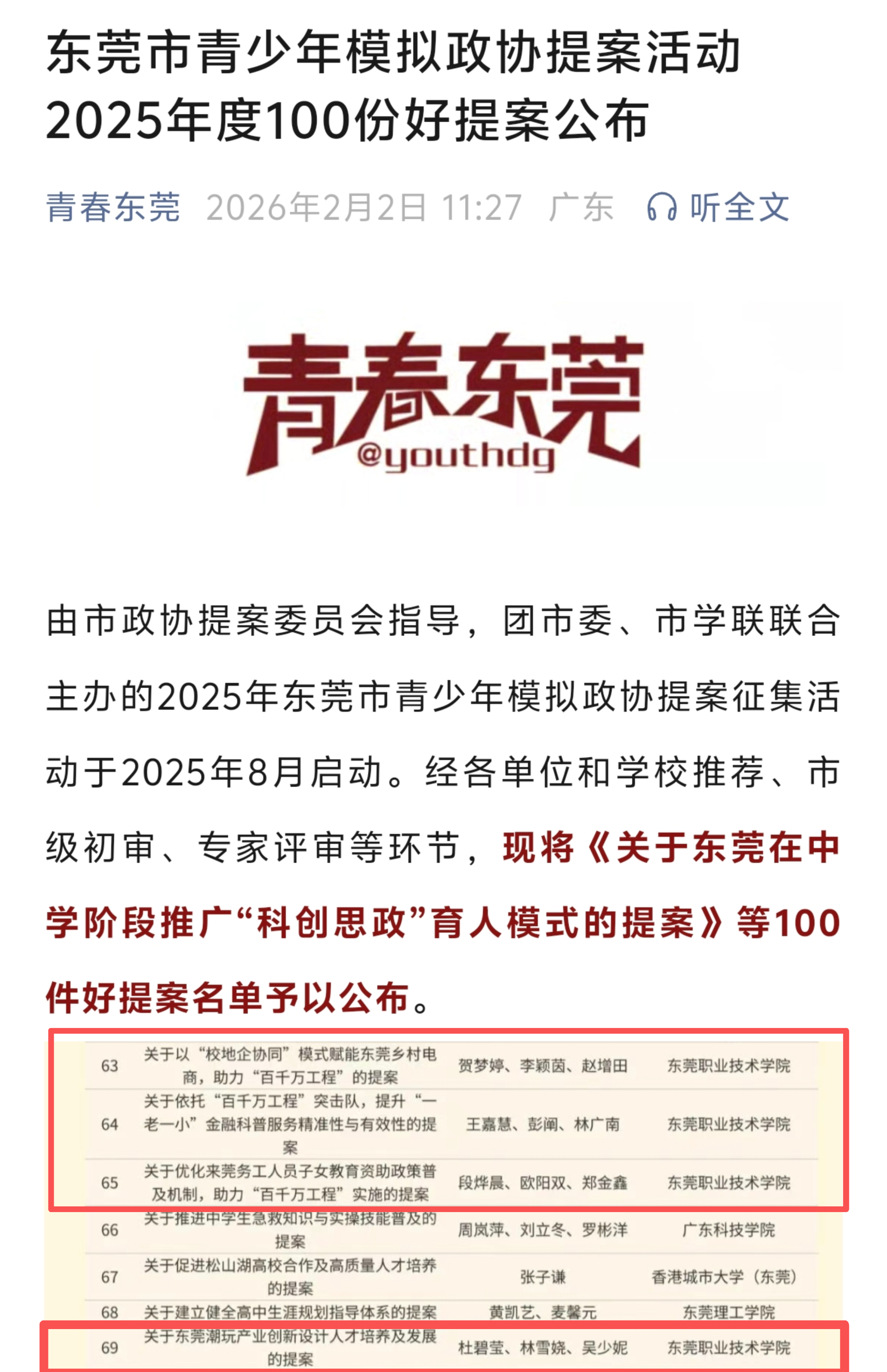 近日,团市委公布 “东莞市青少年模拟政协提案活动 2025 年度 100 份好提案”名单,我校共有 4 份提案凭借扎实的调研、精准的分析和可行的建议成功入选,获评数量位列东莞市各高校第一,充分展现了我校在实践育人领域的显著成效。