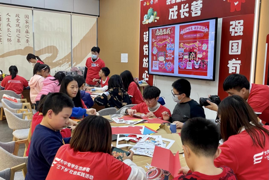 (小学生与志愿者一同完成作品)