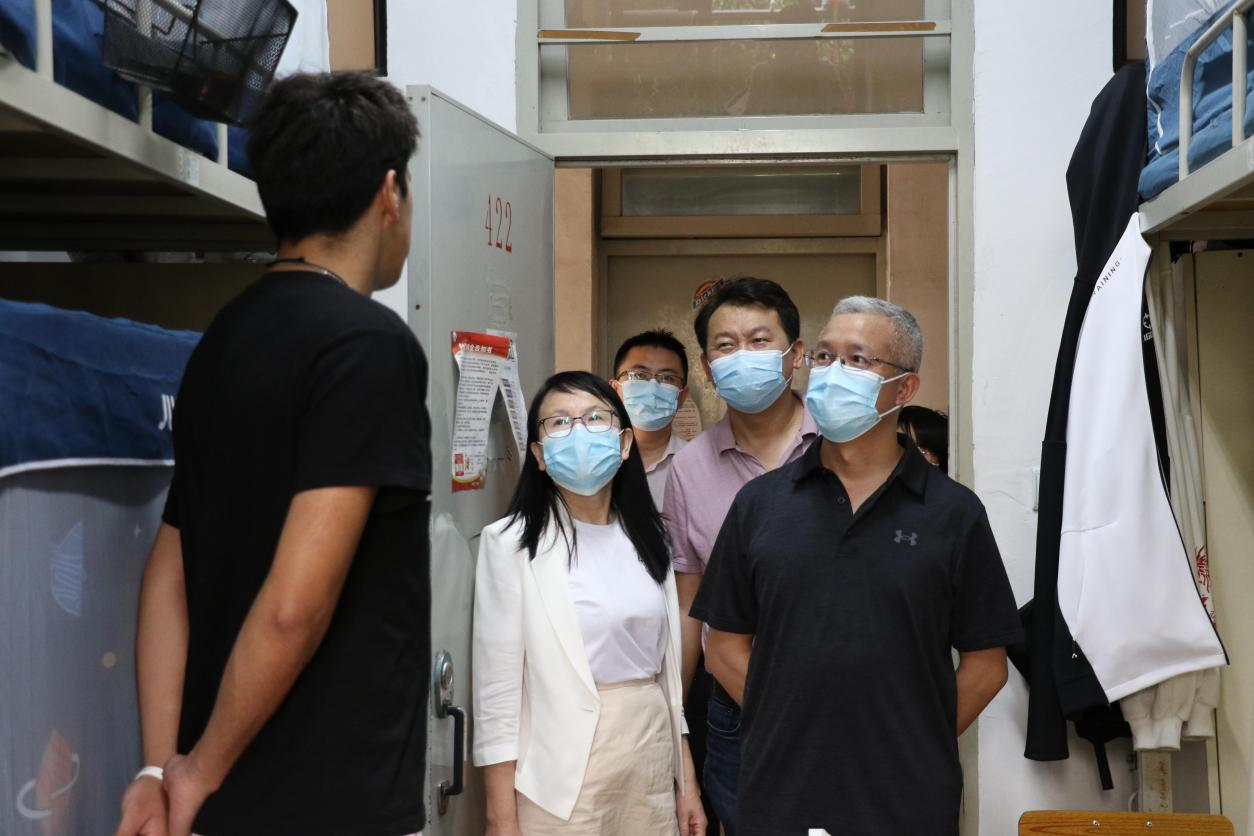 为更好了解经管学院留校学生的学习、生活和健康状况,切实解决疫情防控期间学生遇到的困难,3月15日下午,学校党委委员、教务处处长王志明教授、经管学院党总支书记陈柏林、院长周虹、副院长张文利、辅导员钟银贞老师一起走访学生宿舍。
