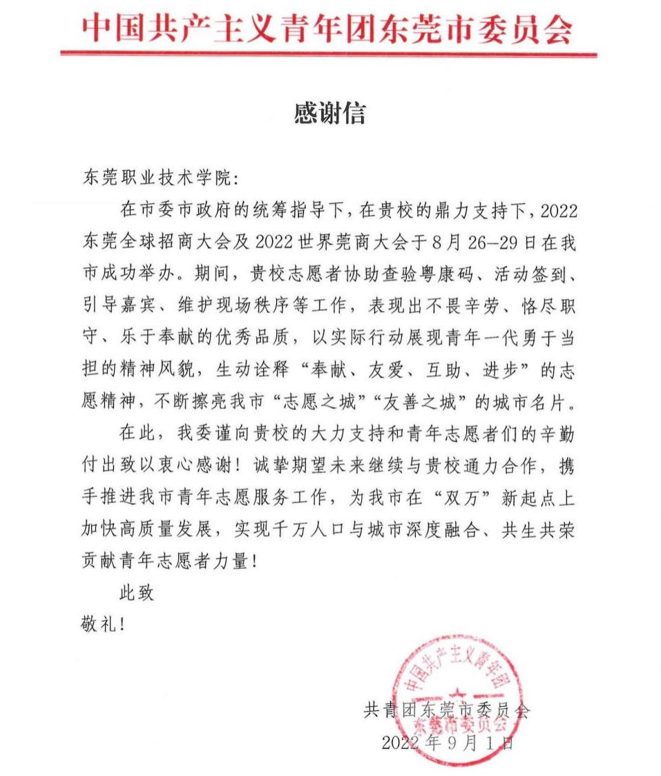 共青团东莞市委员会致我校感谢信