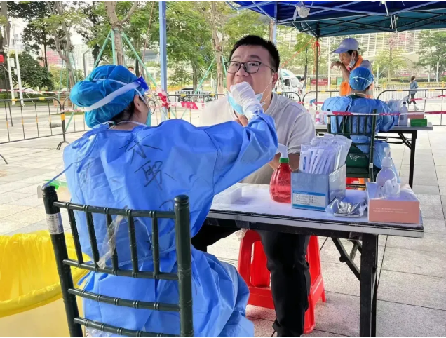 志愿者队伍来到南城医院,双方进行工作交接后,志愿者队伍分为多个小组赴南城社区各采样点协助开展核酸检测。在核酸采样点,卫院学生志愿者在南城医院医护人员的指导下顺利完成当天的核酸采样工作,学生志愿者娴熟的采样技术获得南城医院医护人员的一致好评。