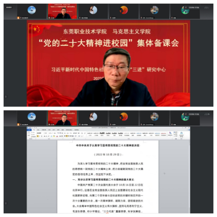 会上,马克思主义学院院长、习近平新时代中国特色社会主义思想“三进”研究中心主任石文斌教授,带领大家集体学习了《中共中央关于认真学习宣传贯彻党的二十大精神的决定》、《关于全市教育系统深入学习宣传贯彻党的二十大精神的通知》、《东莞职业技术学院开展党的二十大精神宣讲工作的实施方案》等文件内容,介绍了本次宣讲工作的整体安排,提出了宣讲工作的要求。紧接着,为中心成员以《以中国式现代化全面推进中华民族伟大复兴》为题,从党的二十大报告总体框架及其逻辑与论断、主题结构及其亮点、新思想及其深层逻辑三个方面,依次从“总体框架”“主题”“逻辑”三个角度,开展“党的二十大精神进校园”宣讲示范授课。