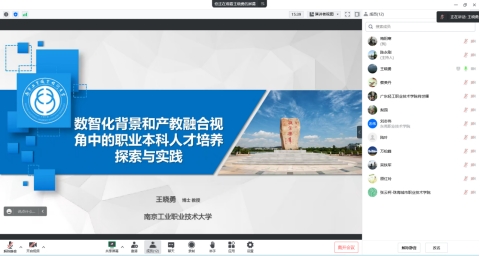12月27日,南京工业职业技术大学机械工程学院院长、全国高校“黄大年式教师团队”主持人王晓勇教授从数字化背景下制造业发展与人才需求、职业教育产教融合人才培养面临困境与思考和职业教育本科智能人才培养探索与实践等方面与学员们分享了南京工业职业技术大学在职业本科人才培养过程中的探索与实践。