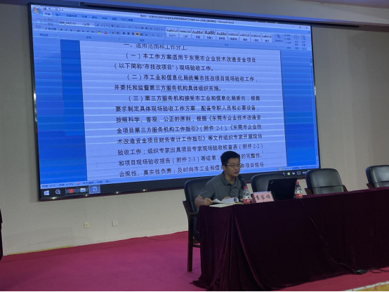 会上,李树峰科长就2023年度东莞市技改验收工作做了项目动员讲话,并对现场核查有关事项提出了明确说明,要求与会专家从专业性角度客观评价、以严谨的工作作风和高度负责态度确保项目验收工作的顺利进行并圆满完成本年度验收工作;袁家顺副科长就项目核查工作文件进行了解读,并就验收工作流程、规则、指引等有关环节提出了具体要求;李国臣教授基于近年来项目核查工作的经验积累,简述了专家现场评审中需要注意的工作内容、技术细节、评审要点和注意事项,并就容易出现的技术争议问题进行了经验分享。