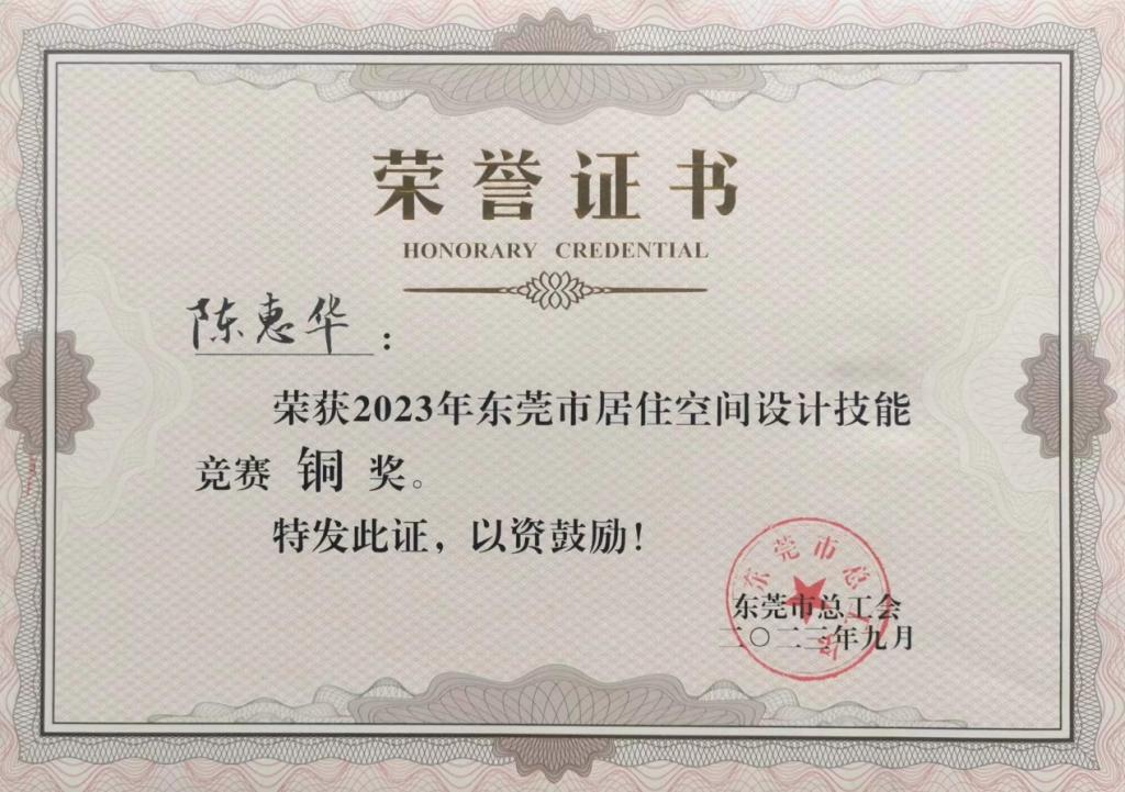 另外,2019级家具艺术设计专业毕业生陈佩珊、2018级毕业生刘婷同学以企业设计师身份参与竞赛角逐,分别斩获金奖、铜奖,校友陈佩珊将被授予“东莞市五一劳动奖章”荣誉称号,展示了我校家具艺术设计专业学子的技能特长和设计水平,拓展学校在东莞家居产业及设计领域影响力,为创意设计学院培养知识型、技能型、创新型高素质技能人才的育人模式做出卓越贡献。