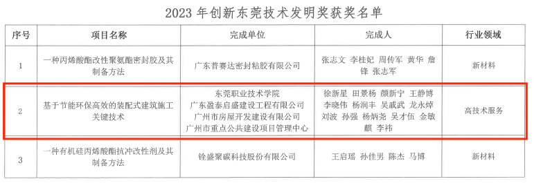 近日,2023年“创新东莞科学技术奖”正式公布,我校作为第一完成单位,联合广东盈泰启盛建设工程有限公司等单位共同申报的“基于节能环保高效的装配式建筑施工关键技术”项目获得“创新东莞技术发明奖”。