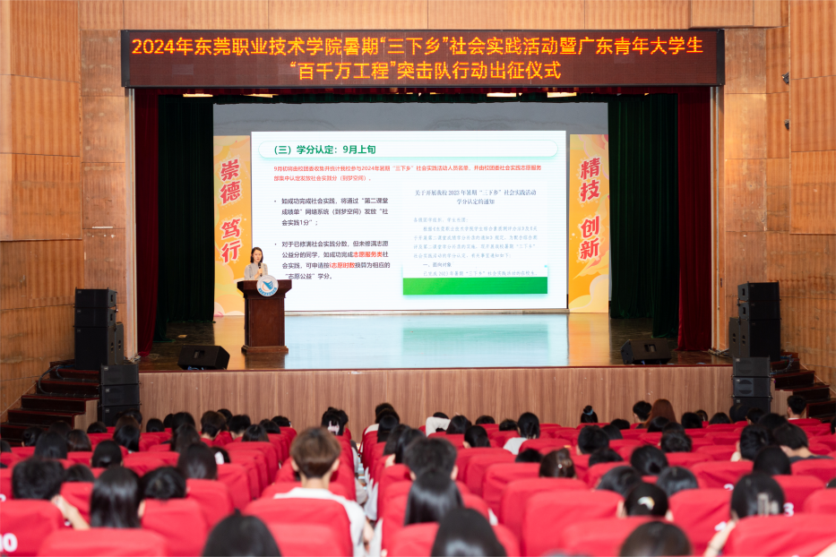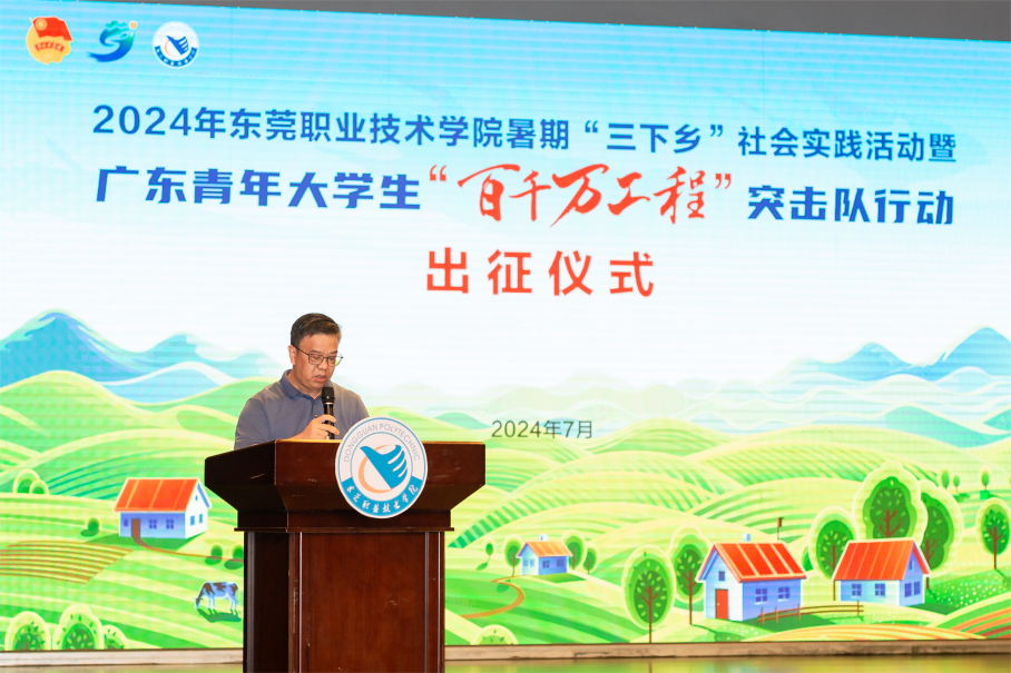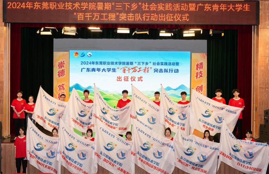 7月3日,我校举行2024年暑期“三下乡”社会实践活动暨广东青年大学生“百千万工程”突击队行动出征仪式,围绕广东青年大学生“百千万工程”突击队行动,拓展14个领域,组建86支校级立项团队,覆盖4省9市13区县35镇,引导广大青年学子赴县镇村一线开展实践。