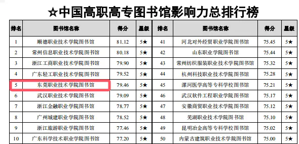 此次评价中,东莞职业技术学院图书馆荣登全国高职高专图书馆影响力排行榜第5名,广东省高职院校第3名,获评五星级图书馆(5★为具有突出影响力的图书馆,即排在最前面的10%)。这一荣誉充分体现了我校图书馆在基础条件保障、资源建设、信息服务、阅读推广、网站建设、新媒体运营及网络影响力拓展等方面的显著成绩。