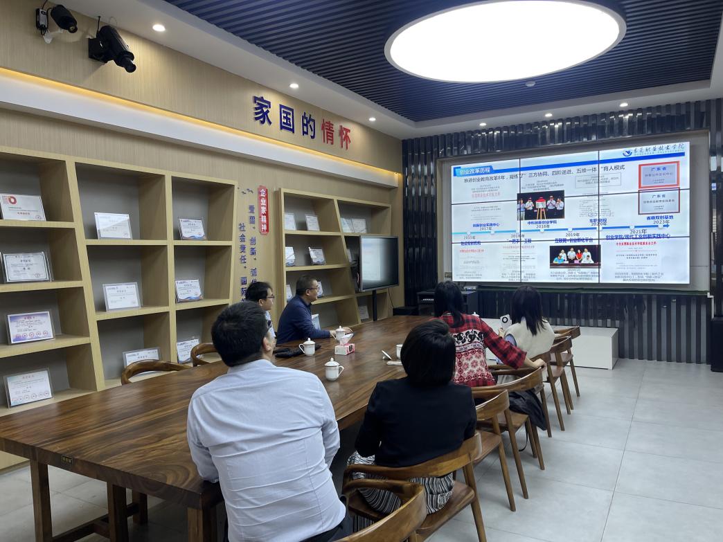 在调研过程中,东莞城市学院团队实地参观了我校省级创新创业实践基地和大学生创新创业孵化基地。李国臣教授详细介绍了我校“三方协同、四阶递进、五维一体”的育人模式,并展示了学生团队研发的跨境电商数字营销平台等创新成果。