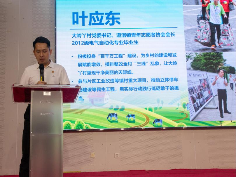 会上,校团委负责“百千万工程”工作的团干现场解读2025年广东大学生志愿服务“百千万工程”专项行动政策,邀请2012级优秀毕业生、大岭丫村村书记、道滘镇青年志愿者协会会长叶应东分享基层工作经历。同时邀请近两年助力“百千万工程”的优秀志愿服务突击队和获得“益苗计划”志愿服务项目大赛省级重点项目的师生代表分享经验做法,为我校更多志愿服务项目落地转化提供新思考。