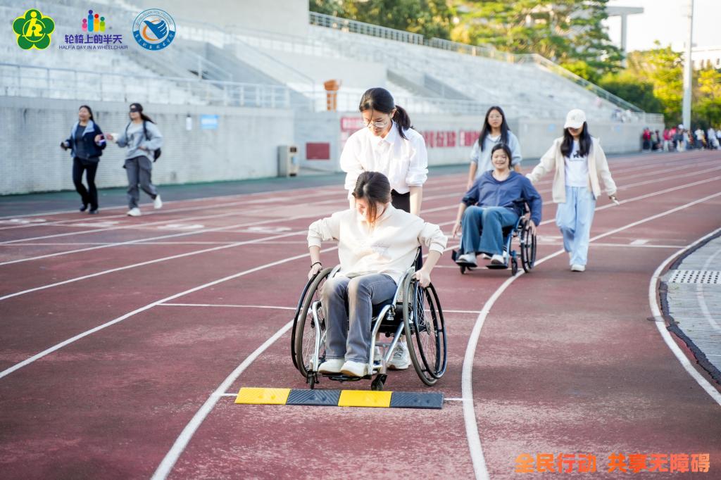 讲座后,“模拟残运会”在操场开展,市残联领导现场观摩指导。学生通过轮椅体验、蒙眼跑等互动项目,直观感受无障碍设施对安全、信任和平等的重要意义。短短几分钟的体验,让学生理解了坡道、盲道背后是怎样的生活挑战,也让他们体会到无障碍建设承载着人与人之间相互扶持的力量。