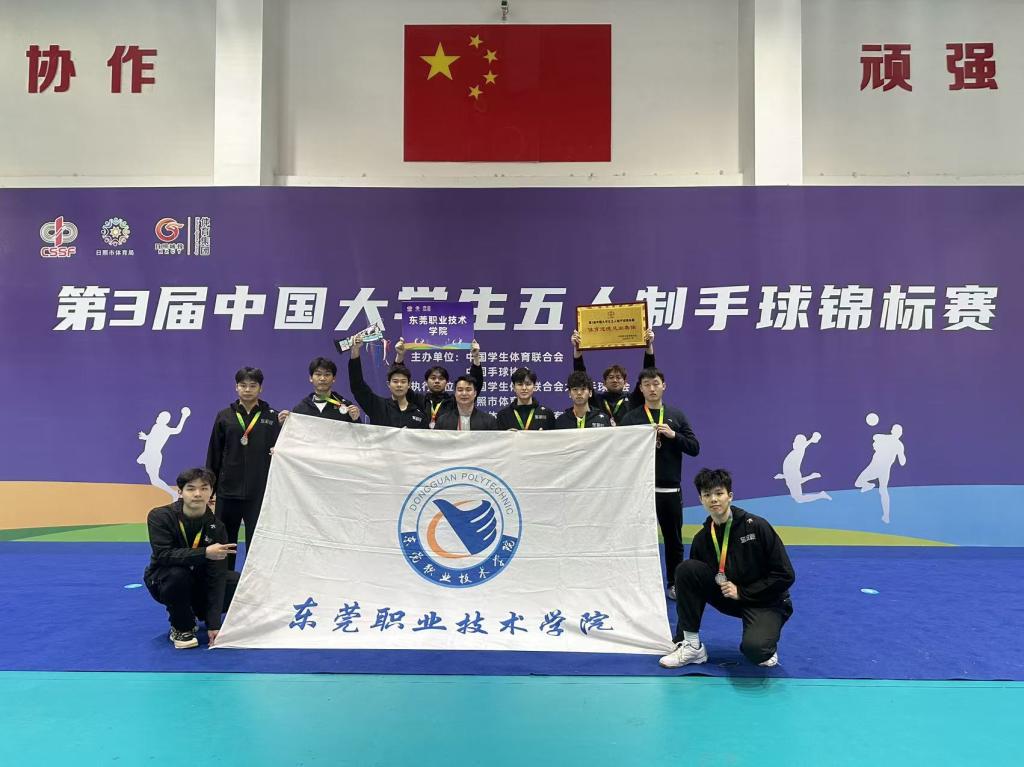 11月28日,第三届中国大学生五人制手球锦标赛在山东日照香河体育公园顺利闭幕。本次赛事由中国学生体育联合会、中国手球协会联合主办,经过五天的激烈角逐,东莞职业技术学院男子手球代表队奋勇拼搏、发挥出色,最终夺得男子丙A组(体育专业组)亚军,在全国高水平竞技舞台上展现了我校学子良好的竞技水平和精神风貌。