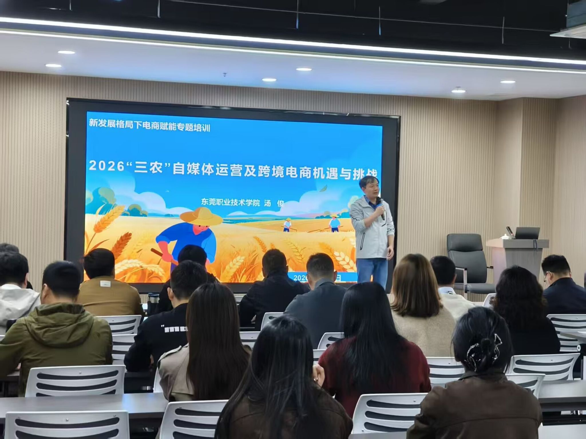 3月20日,商学院(筹)一行赴揭东区开展乡村振兴电商帮扶活动,在揭阳市经开区产业服务中心开展了《电商赋能乡村振兴与跨境电商新发展——“三农”自媒体运营及2026跨境电商机遇挑战》专题培训举行。电子商务负责人汤俊副教授聚焦“三农”自媒体账号构建、短视频直播实操技巧、农产品品牌塑造及跨境电商发展趋势等核心内容,为各驻镇工作队成员及属地电商企业代表作了精彩的专题分享。