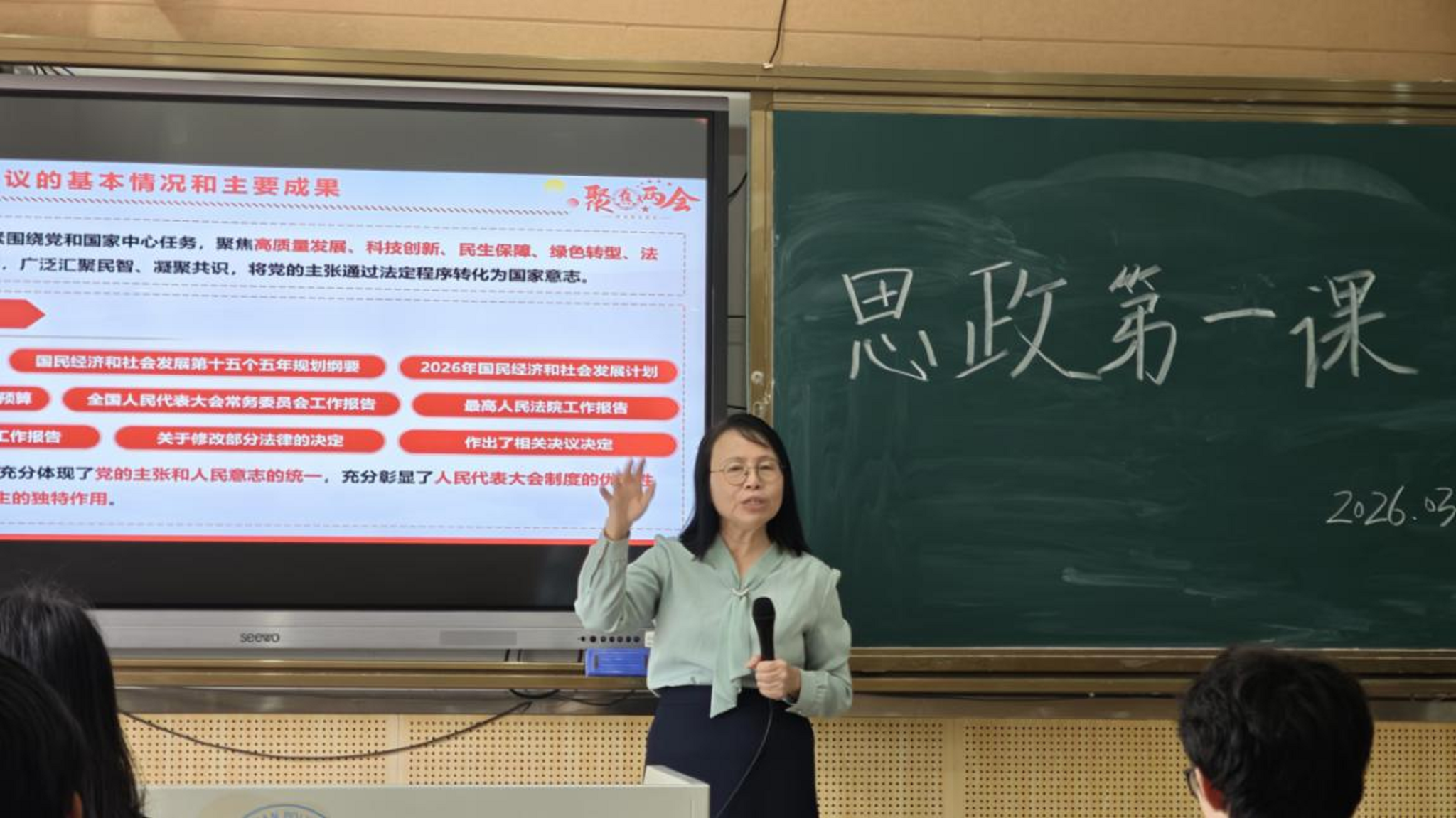 课堂上,周虹教授结合人大代表的亲身经历与深刻感悟,用通俗易懂的语言、鲜活生动的案例,系统解读了2026年全国两会的核心要义,重点围绕职业教育高质量发展、技能人才培养、新质生产力发展等与同学们息息相关的内容展开分享。她指出,今年两会再次强调“提升职业学校办学能力,建设特色鲜明高职院校”,明确提出要推动职业教育与产业发展深度融合,培养更多适应新时代需求的高素质技术技能人才,这为职业院校学生的成长与发展指明了方向、提供了机遇 。