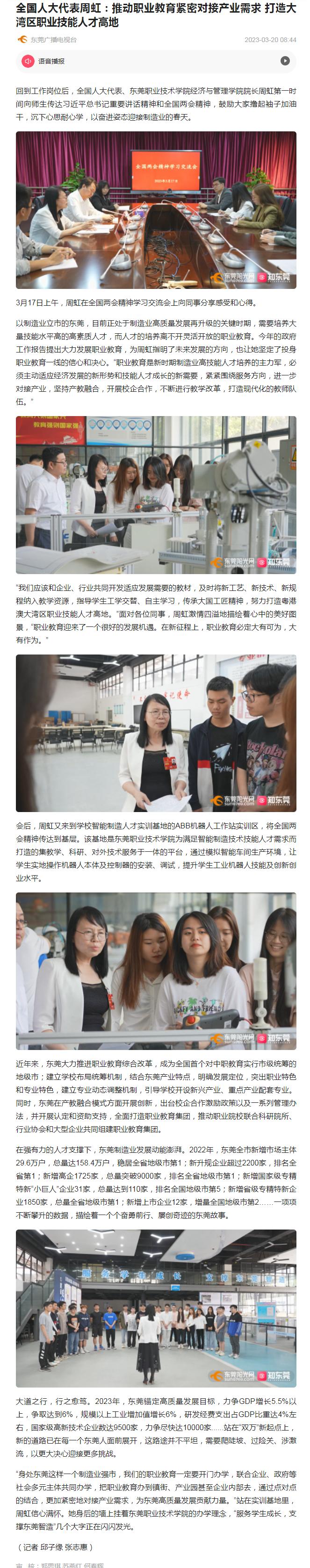 【东莞广播电视台】全国人大代表周虹:推动职业教育紧密对接产业需求 打造大湾区职业技能人才高地