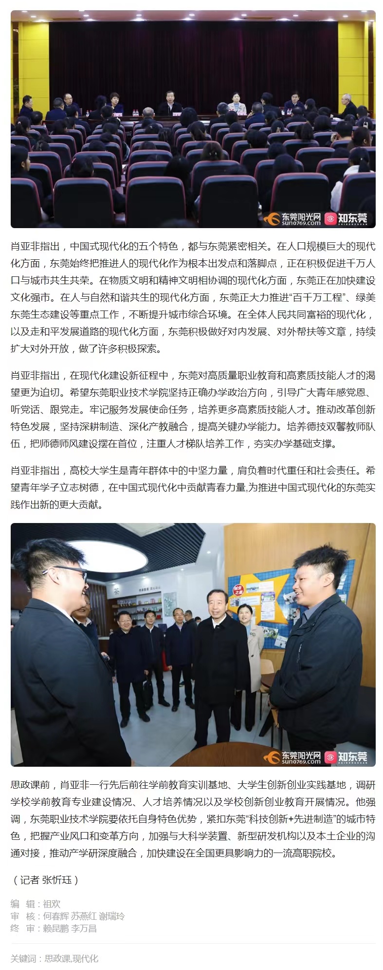 【东莞广播电视台】肖亚非到东莞职业技术学院讲授思政课并调研 在推进中国式现代化的时代潮流中更好实现人生价值