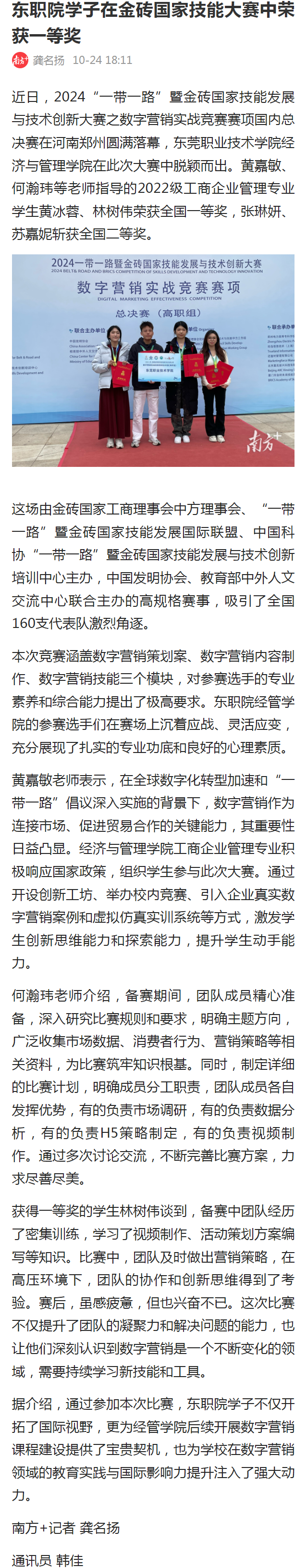【南方+】东职院学子在金砖国家技能大赛中荣获一等奖